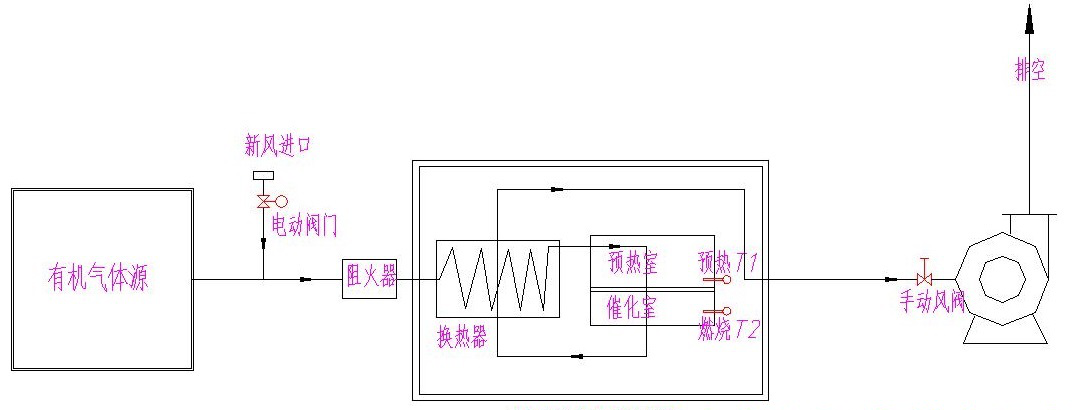 有机气体首先通过除尘阻火器系统,然后进入换热器,再送入到加热室,通过加热装置,使气体达到燃烧反应温度,再通过催化床的作用,使有机气体分解成二氧化碳和水,再进入换热器与低温气体进行热交换,使进入的气体温度达到反应温度,节省能源。